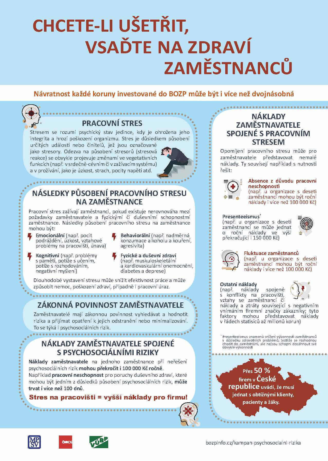 Dnes vám přinášíme druhý díl mediální kampaně Výzkumného ústavu bezpečnosti práce, která je zaměřená na psychosociální rizika a poruchy pohybového aparátu. ČMKOS považuje bezpečnost práce a prevenci pracovních úrazů za jedno z nejdůležitějších témat, proto nám je ctí, že můžeme společně s Ministerstvem práce a sociálních věcí být u této kampaně.